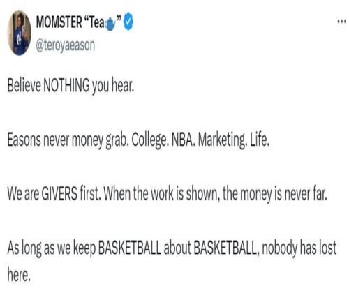 她写道:“别相信你听到的任何传言。伊森家的人从不贪图钱财——无论是上大学、打NBA、做商业推广,还是生活中,我们始终把‘付出’放在第一位。只要展现出实力,财富自然会随之而来。只要我们始终专注于篮球本身,就没有人会是输家。”